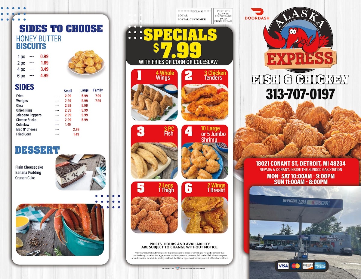 The Alaska Express (Fish & Chicken) Conant St Menu offers a satisfying variety of comfort food that keeps patrons coming back for more. Known for its delicious fried fish and crispy chicken, this restaurant is a go-to for anyone craving a flavorful, hearty meal. The menu is packed with options that cater to a wide range of tastes. From the golden fried catfish and whiting to the mouthwatering chicken wings and tenders, there's something for everyone. The fish is perfectly seasoned, crispy on the outside, and tender on the inside, making it a standout dish. The chicken, similarly, is seasoned to perfection, providing a crunchy bite with every piece.